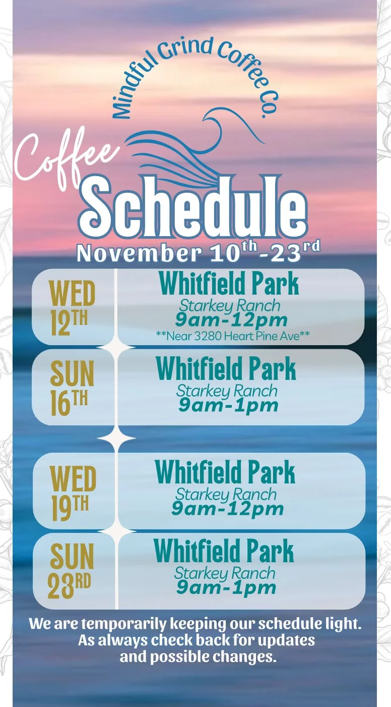 Our schedule changes weekly and we try to post on Sundays where you can find us for the next week. Sometimes we experience last minute changes due to weather and unforeseen circumstances. Please check out our daily updates section to see those changes. You may also text/call us for updates.
